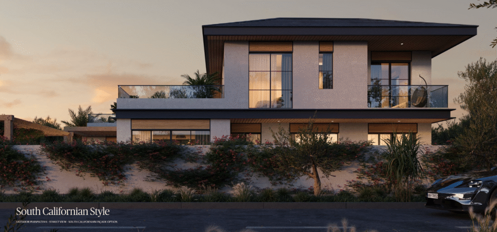 Each Al Naseem villa in Hudayriyat is designed in one of two signature styles – South Californian or Modern Contemporary – with expansive floor-to-ceiling windows, double-height living spaces, private gardens
